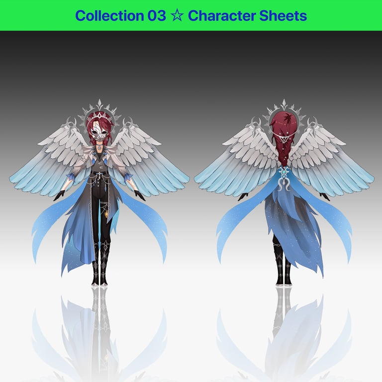 A collection of 4-view Character Reference Sheets featuring both personal and commissioned original characters.