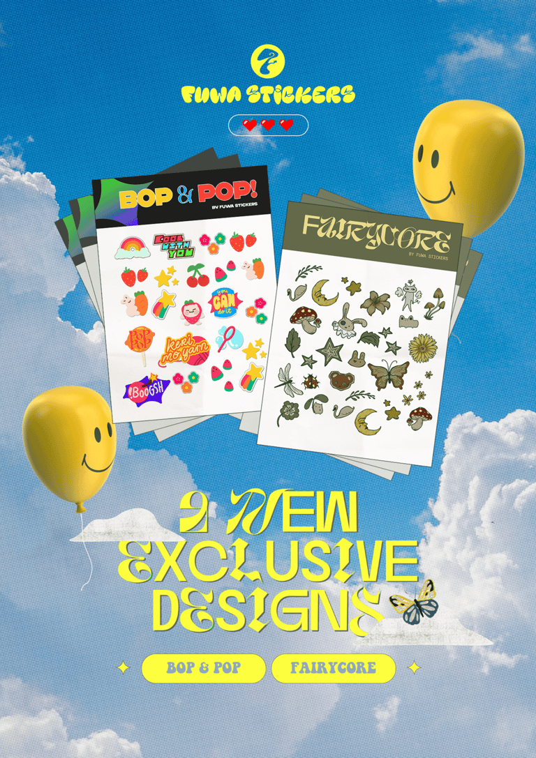 Our team and I decided to create two sets of stickers as our original products, with concepts that greatly contrast each other: ”Sticker Set A - Fairycore,” which features illustration aesthetics inspired by folklore, fairies, and enchanted forests. Meanwhile, “Sticker Set B - Bop & Pop” features illustration aesthetics based on pop colors, fruits, and objects.