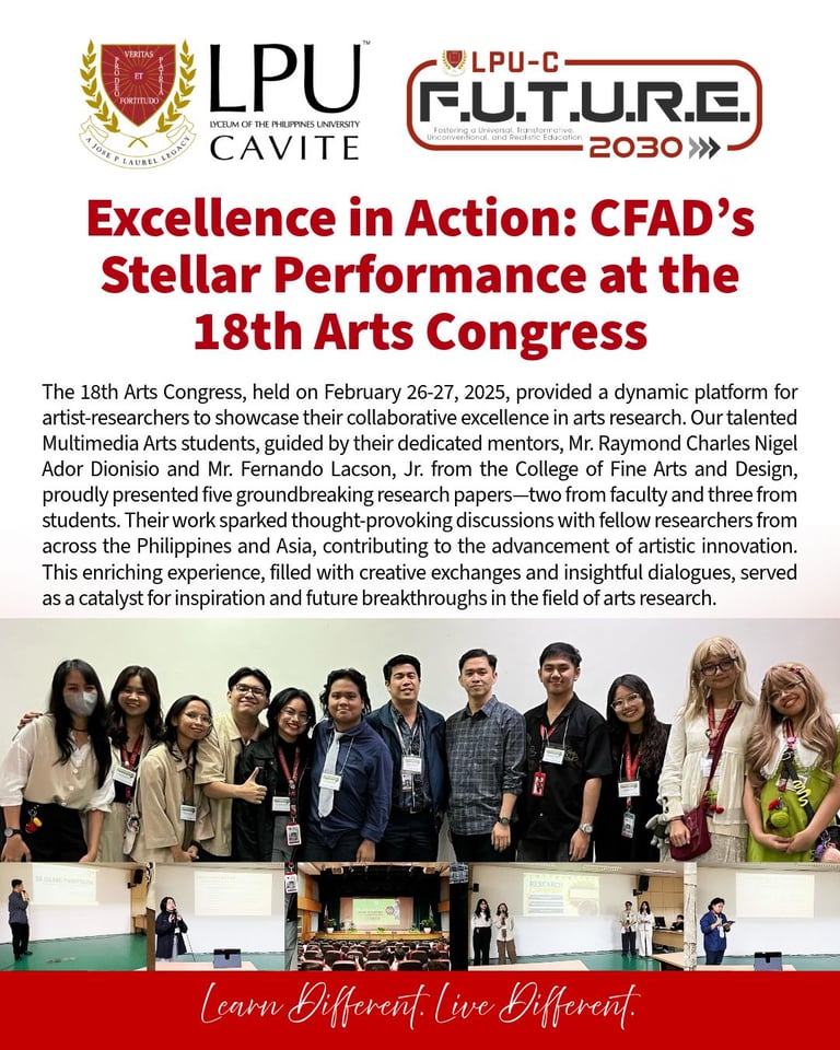 Our presentation at the DLSU 18th Arts Congress was featured in the Lyceum of the Philippines University - Cavite Official Page for representing both the University and the College of Fine Arts and Design (CFAD).