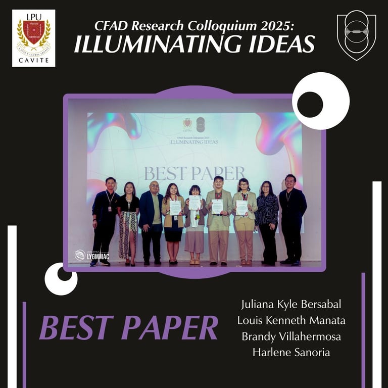 Our thesis extended abstract was reviewed and accepted for presentation at the 18th Arts Congress at De La Salle University–Manila, allowing us to share our research with fellow scholars and represent Lyceum of the Philippines University–Cavite.